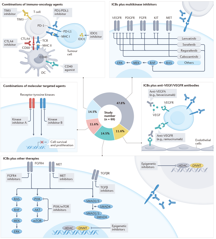 覃文新 和王存团队对进展期肝癌联合治疗策略进行了深入阐述,将其分为以下五类: 基于靶向药物的联合治疗 、 基于免疫药物的联合治疗 、 免疫药物与血管生成抑制剂的联合 、 免疫药物与多靶点激酶抑制剂的联合 以及 免疫药物与其它药物的联合 ,通过全面总结针对这些疗法的临床试验,描绘了一幅进展期肝癌系统治疗的“全景图谱”。