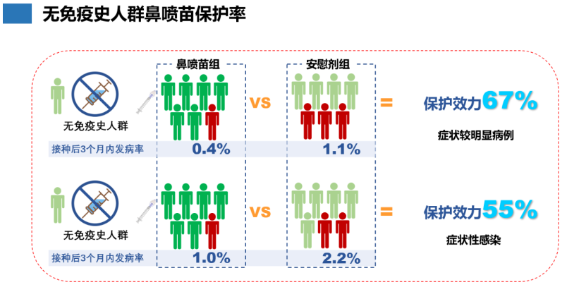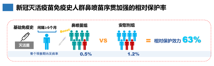 临床试验数据显示,无论作为基础免疫还是序贯加强免疫,鼻喷苗对奥密克戎变异株感染导致的新冠病毒病(COVID-19)具有良好保护效果:
