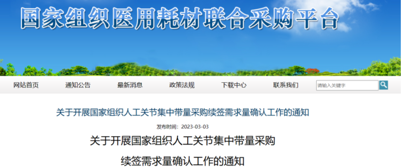 今日(3月3日),国家组织高值医用耗材联合采购办公室发布《关于开展国家组织人工关节集中带量采购续签需求量确认工作的通知》,为确保国家组织人工关节集中带量采购首年协议期满后平稳有序衔接第二年协议期,开展中选产品续签需求量确认工作。