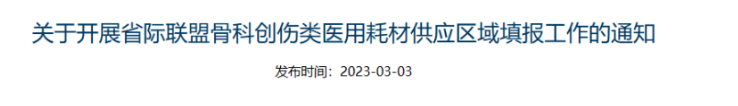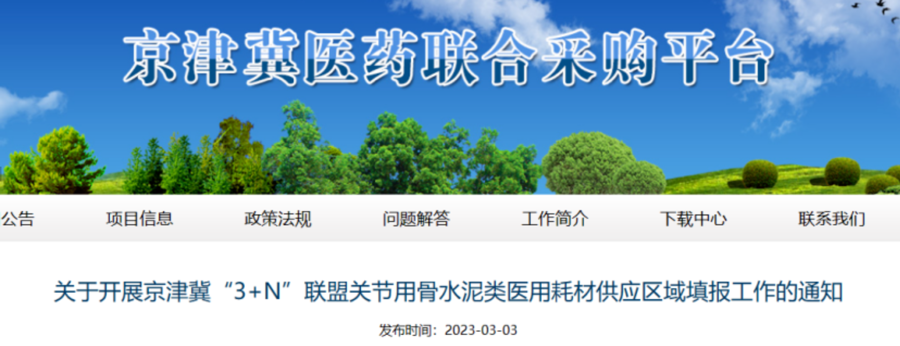 同样在今日,京津冀医药联合采购平台发布了《关于开展京津冀“3+N”联盟关节用骨水泥类医用耗材供应区域填报工作的通知》《关于开展省际联盟骨科创伤类医用耗材供应区域填报工作的通知》。