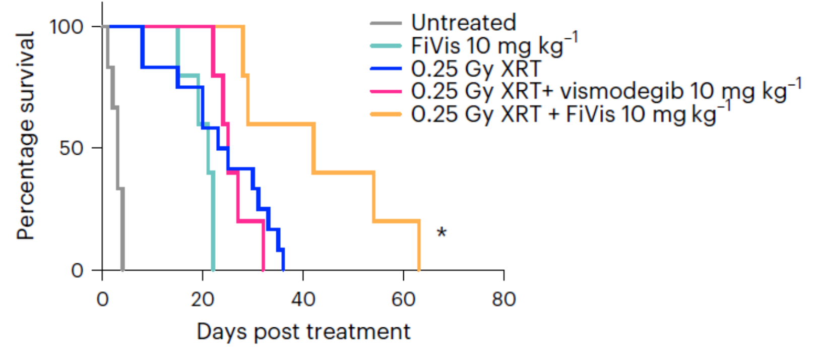研究团队使用具有完整血脑屏障的SHH-MB小鼠模型上验证了这一岩藻多糖-纳米颗粒药物递送平台的效果。实验结果显示, 装载Vismodegib的岩藻多糖-纳米颗粒 (简称FiVi) ,能够在低剂量下展示出强大抗肿瘤效果,并且显著减弱了骨毒性。 此外,辅助极低剂量的放疗 (XRT) ,还能够进一步增强治疗效果。