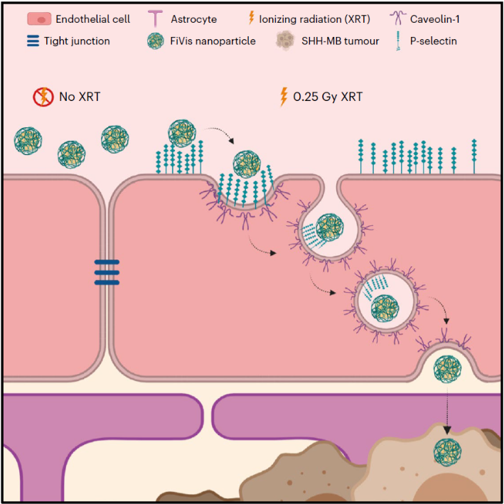 利用这一机制, 研究团队开发了靶向P-选择素的岩藻多糖-纳米颗粒,这一纳米载体携带的抗癌药物Vismodegib,能够更高效突破血脑屏障(BBB),主动转运到脑肿瘤组织,而不影响正常大脑组织,在小鼠模型中展示了更强的癌症治疗效果和更低的副作用。同时,辅助低剂量放疗,能够促进内皮细胞的P-选择素表达水平,进一步增强治疗效果。