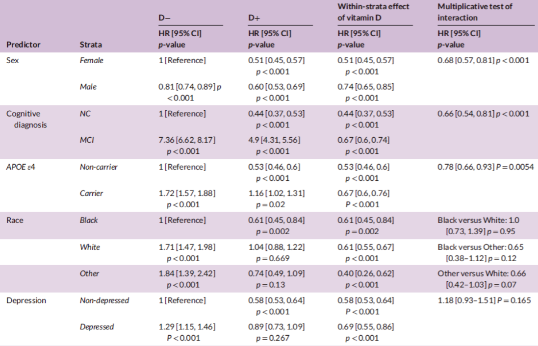 研究人员还分析了APOE-4基因(阿尔茨海默病主要风险基因)的影响,发现维生素D对不携带APOE-4基因的人的影响也明显更大。