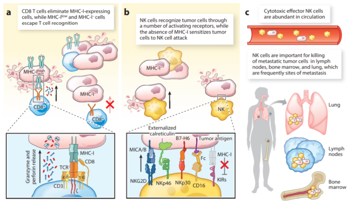 T细胞和NK细胞在肿瘤细胞识别的分子机制上有根本不同。T细胞通过TCR介导的MHC结合肽抗原识别肿瘤细胞。T细胞的所有关键功能都在TCR的控制下,包括细胞毒性、细胞因子产生和增殖。因此,肿瘤可以通过下调或丢失MHC-I表达逃避CD8+T细胞的作用。