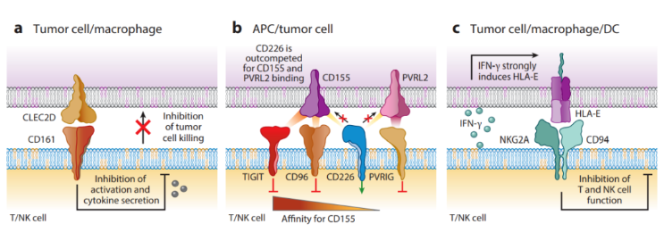 CD96和PVRIG受体的研究较少。在小鼠模型中,CD8+T细胞或NK细胞中CD96受体的失活增强了抗肿瘤免疫,但其在人类细胞中的作用尚不清楚。PVRIG也由T细胞和NK细胞表达,其主要配体是PVRL2。