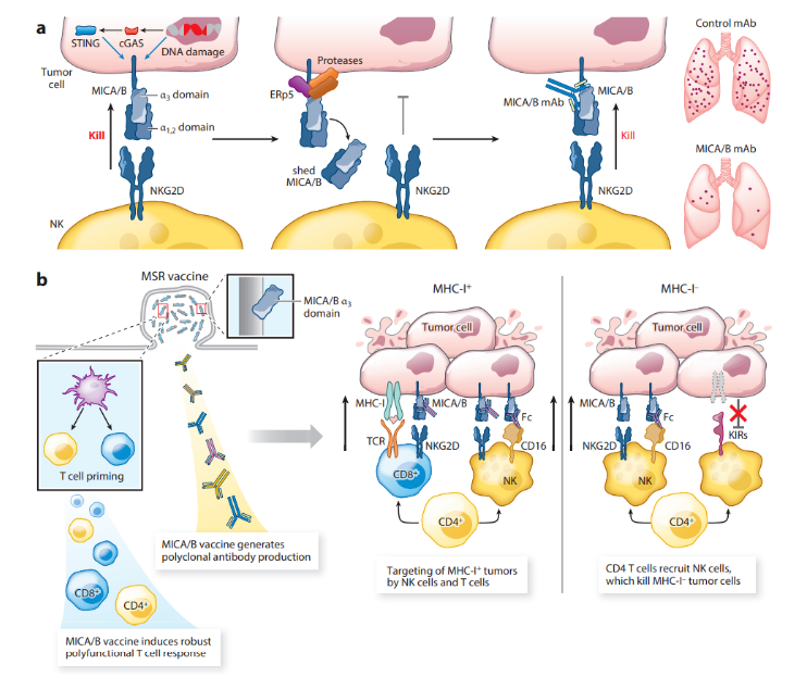 一种引发T细胞和NK细胞双重攻击的疫苗可以防止MHC-I缺陷型肿瘤克隆的出现,因为MHC-I表达的缺失使肿瘤细胞更容易被NK细胞杀死。人类肿瘤通过活化的MICA和MICB配体在肿瘤细胞上的蛋白水解脱落来逃避活化NKG2D受体的识别。靶向参与蛋白水解脱落的MICA/Bα3结构域的癌症疫苗诱导高滴度抗体,可以抑制脱落并增加肿瘤细胞表面MICA/B蛋白的密度。该疫苗诱导多种T细胞和NK细胞群体显著归巢小鼠肿瘤。