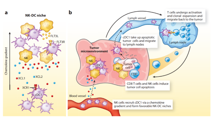 两项主要研究表明,NK细胞在向肿瘤募集cDC1中起着关键作用。第一项研究表明,NK细胞分泌趋化因子,介导cDC1募集到肿瘤中,特别是XCL1、XCL2和CCL5。这是一个重要的发现,因为cDC1选择性表达XCL1/2的XCR1趋化因子受体。第二项研究侧重于FLT3配体,这是一种调节DC分化和存活的关键细胞因子。在NK细胞中检测到这种重要细胞因子的表达。研究显示, NK细胞(而不是T细胞)的清除大大减少了cDC1向肿瘤的募集。这些研究证明了肿瘤中NK细胞和T细胞反应之间的重要联系:NK细胞募集并支持DC的存活,而DC又对T细胞介导的肿瘤免疫至关重要。