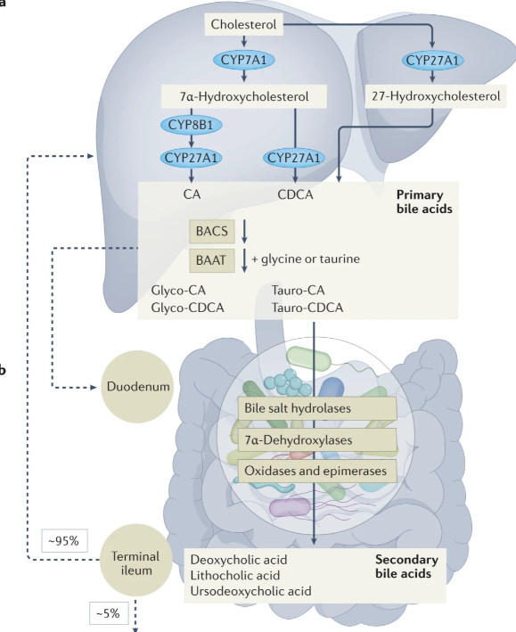 (a)初级胆汁酸(BAs)由肝脏中的胆固醇通过经典(胆固醇7α-羟化酶(CYP7A1)介导)途径或替代(固醇27-羟化酶(CYP27A1)介导)途径合成。BA-CoA合成酶(BACS)和BA-CoA:氨基酸N-酰基转移酶(BAAT)催化BA酰胺化(结合)与甘氨酸或牛磺酸形成胆盐。(b)肠道微生物群将分泌到十二指肠的BA代谢为次级BA。到达回肠末端的约95%的BA进行肝脏再循环。