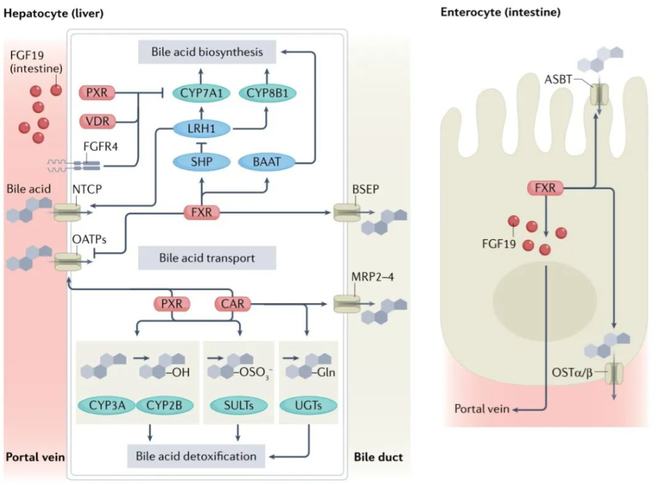 PXR、CAR和VDR是密切相关的核受体,在BA解毒和清除过程中发挥相似的作用。虽然CAR没有任何已知的BA配体,但这三种核受体都能促进肝毒性LCA 的清除。LCA激活的PXR和VDR增加了CYP3A和SULT的表达。它们还促进了LCA输出蛋白OATP2和多药耐药蛋白3 (MrP3)的表达。此外,PXR、CAR和VDR通过FGF15/FGF19途径抑制CYP7a1,有助于BA稳态。