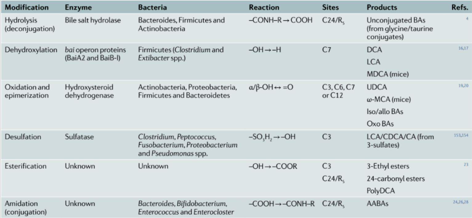 细菌进一步使解偶联BAs的类固醇脱羟基和异构化。CA和CDCA的C7羟基的脱羟基作用将BAs分别转化为次级BAs DCA和LCA。在小鼠体内,α-MCA和β-MCA也会产生一种6β-羟基化的BA——熊去氧胆酸。细菌的bai操纵子负责BAs的脱羟基化。最近,对Clostridium scindens的8个bai基因产物鉴定工作已经完成。通过使用单基因缺失和插入,6种酶促反应被证明是在Clostridium sporogenes中生成DCA和LCA的必要条件。虽然在小鼠体内表达bai的Extibacter muris和Clostridium spp.是罕见的,并且仅在盲肠和结肠产生脱羟基BAs,但它们能产生约500 mg的DCA和LCA。