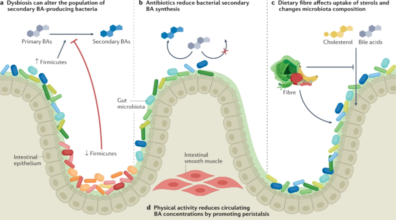 生态失调(a)或抗生素(b)可减少7α-脱羟基化厚壁菌的数量,从而扰乱次级胆汁酸(BA)水平。(c)饮食中胆固醇的摄入会增加总BA库,但不溶性纤维可以结合和隔离肠腔中的胆固醇和BAs。益生元和其他膳食成分也调节微生物群的组成。(d)运动相关的肠道转运时间缩短降低了次级BAs的浓度和BAs的重吸收,因为它们的排泄速度更快。
