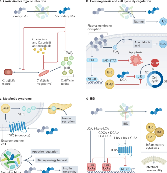 (a)初级BAs促进梭菌萌发,而次级BAs则抑制其萌发。次级BAs可以提高抗菌剂对艰难梭菌的疗效,并隔离艰难梭菌毒素;(b)次级BAs通过多种机制与致癌作用相关。细菌解偶联的牛磺酸进一步代谢成致癌的硫化氢。次级BAs使磷脂酶A2(PLA2)将磷脂代谢为花生四烯酸,最终释放破坏DNA的活性氧(ROS)。NF-κB介导的促炎因子IL-6和IL-1β的表达分别通过JAK-STAT途径抑制细胞凋亡,并通过p53抑制细胞周期阻滞;(c)在肠内分泌细胞中,TGR5激动剂刺激胰高血糖素样肽1(GLP1)的合成,GLP1循环至胰岛β细胞以诱导胰岛素分泌。(d) BA激活PXR、FXR和单核细胞TGR5通过抑制NF-κB降低炎症细胞因子水平和肠道通透性。