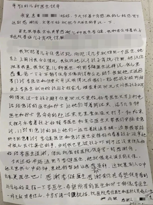 事后,患儿的母亲也为儿科及发热门诊医护送上了长长的手写感谢信。