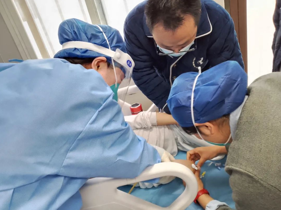 来到发热门诊后,李健与两位发热门诊值班护士顾陈婕、费青一同迅速为患儿测量生命体征。检查结果显示,康康体温达到40.7℃、心率150次/分、氧饱96%,已出现意识不清的情况。李健一边给予吸氧、药物注射、开放静脉补液等对症措施,一边汇报科室,请儿科护士李婷第一时间将儿童用药送至发热门诊。发热门诊值班护士也以扎实的专业知识和娴熟的操作配合医生进行抢救及急救护理,并密切观察患儿病情变化和给药反应。