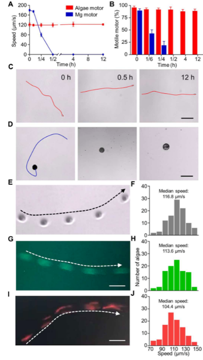 莱茵衣藻通过以50 Hz的频率同步拍打两个鞭毛游泳,能达到高达200μm/s的速度。与化学动力镁基马达相比,莱茵衣藻在肠液中显示出更强的推进力。