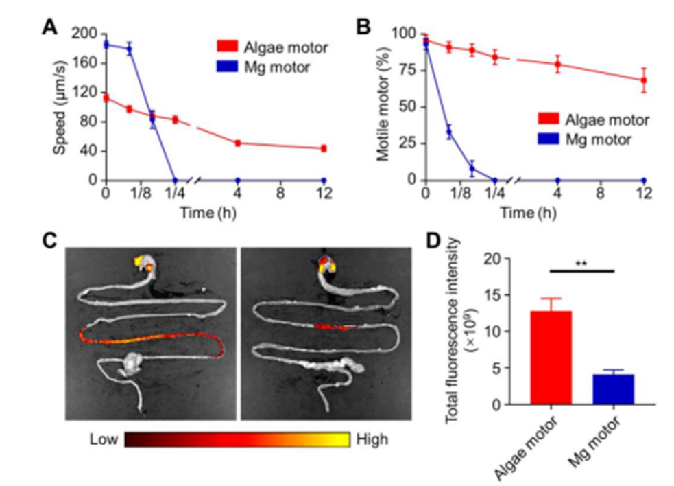 模仿肠道的生理条件,评估37℃下藻类马达和镁基马达的运动行为(图A和B),结果显示藻类马达的速度受到温度的影响,12小时后降至40μm/s,有约70%的藻类仍能活动。相比之下,传统的镁基马达很快失去了运动,15min后仅有8%保持运动。这些数据表明藻类马达的性能更佳,即使在不利的条件下也可以长时间存活。