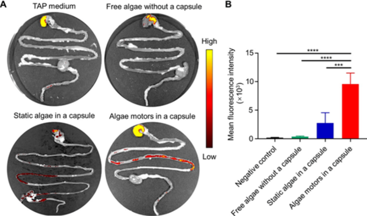 作者开发了一种藻类胶囊系统,用于有效的肠道靶向和延长组织滞留。与镁基马达相比,藻类马达在胃肠液中显示出持久的推进力,使药物在胃肠道中显示出更广泛的分布和更强的滞留,用于口服给药治疗潜在的胃肠疾病和病症,并显示出良好的安全性。