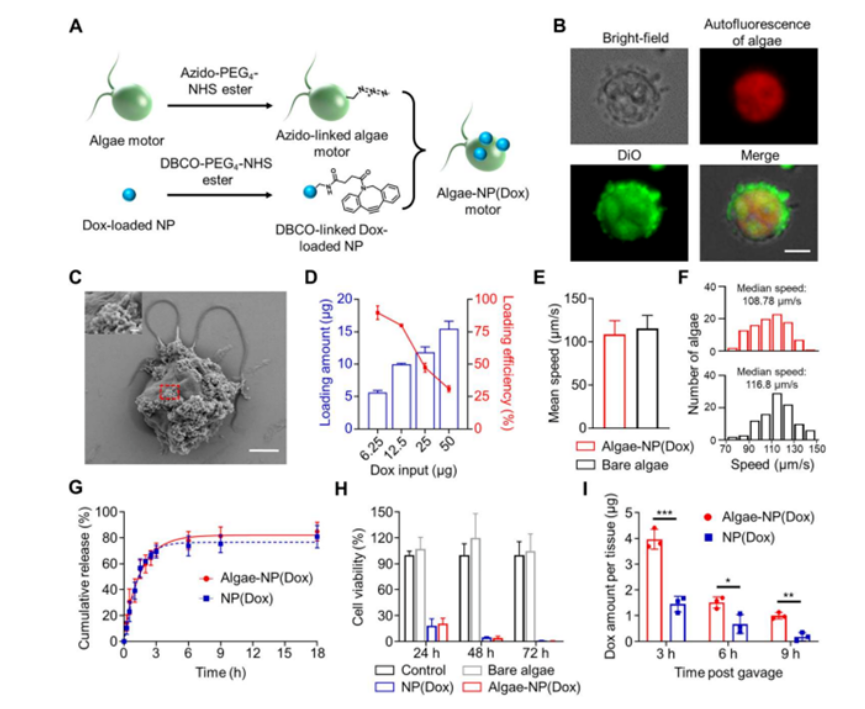 进一步探讨使用藻类马达在胃肠道递送治疗药物的可行性。Dox(阿霉素)是一种常用的一线化疗药物,被选为模型药物有效载荷。荧光和扫描电镜成像都证实了NP(Dox)与藻类的有效结合(图B和C)。