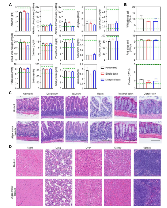 对于微生物载体的应用,其体内安全性的评价至关重要。在给药后24小时后,对未处理小鼠、单剂量治疗小鼠和多剂量治疗小鼠进行了全面的血液化学检查和血细胞计数,结果如图A和B。与未经治疗的对照小鼠相比,接受莱茵衣藻纳米马达胶囊治疗的小鼠中所有血清生化标志物和血细胞(红细胞、白细胞和血小板)的数量保持在正常水平。在长期安全性研究中,多剂量小鼠也得到相同的结果, 由此观察到代谢生物标志物和血细胞指标的微小变化中可以发现蓝藻胶囊的毒性可以忽略不计。