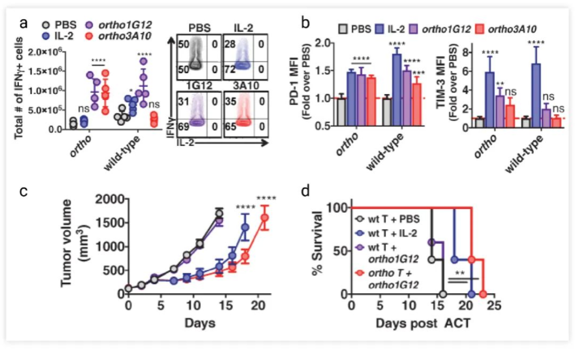 a-b. 在 Fig. 2 的过继转移模型中,小鼠脾脏中 IFN-γ 阳性野生型或 orthoIL-2Rβ CD8+ T 细胞数量和细胞表面 PD-1 和 TIM-3 的表达水平。c-d. 荷瘤小鼠 (B16-F10 肿瘤) 在野生型或 orthoIL-2Rβ Pmel-1 改造的 CD8+ T 细胞和 IL-2 或 orthoIL-2 (1G12) 处理条件下肿瘤的体积变化和存活率