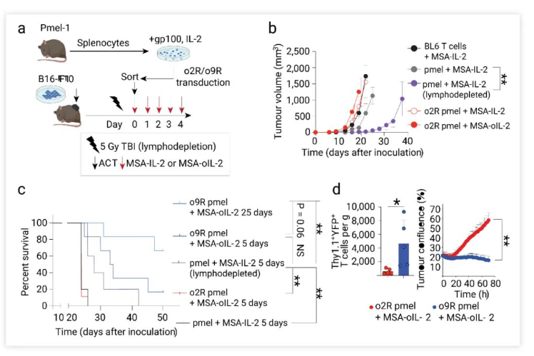 a.Pmel 模型示意图。从小鼠脾脏中分离出 Pmel-1 T 细胞,分别改造为 o2R 和 o9R Pmel T 细胞,然后过继转移至黑色素瘤荷瘤鼠体内。荷瘤鼠接受辐照,或 MSA-IL-2 和 MSA-oIL-2 治疗 5 天。b-c. 肿瘤体积变化曲线和小鼠的存活率 。d. 与 o2R Pmel T细胞相比,o9R Pmel T 细胞浸润更大。
