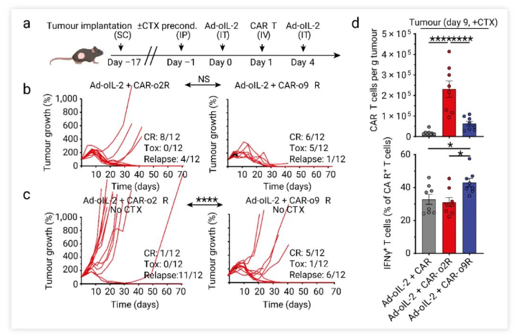 研究人员还使用了一种具有免疫治疗抗性的胰腺癌模型 (PDA7940b,表达间皮素)验证这一体系在 CAR-T 治疗中的作用。 在胰腺癌动物模型 (PDA7940b) 中,单独使用 Ad-oIL-2 腺病毒载体或 CAR-o2R 或 CAR-o9R T 细胞治疗对控制肿瘤生长无效,然而,Ad-oIL-2+CAR-o2R T 细胞+化疗组 (67% 肿瘤完全消退) 或 Ad-oIL-2+CAR-o9R T 细胞+化疗组 (50% 肿瘤完全消退) 的联合治疗有明显抑瘤效果 (Fig. 7b)。在没有化疗组的情况下,Ad-oIL-2+CAR-o9R T 细胞抑瘤效果更加明显,肿瘤完全消退率为 42%。此外 CAR-o9R T 细胞在体外对胰腺癌细胞也显示出优越的抗肿瘤功效 (Fig. 7c)。CAR-o9R T 细胞的杀伤肿瘤效力更强。