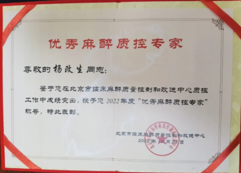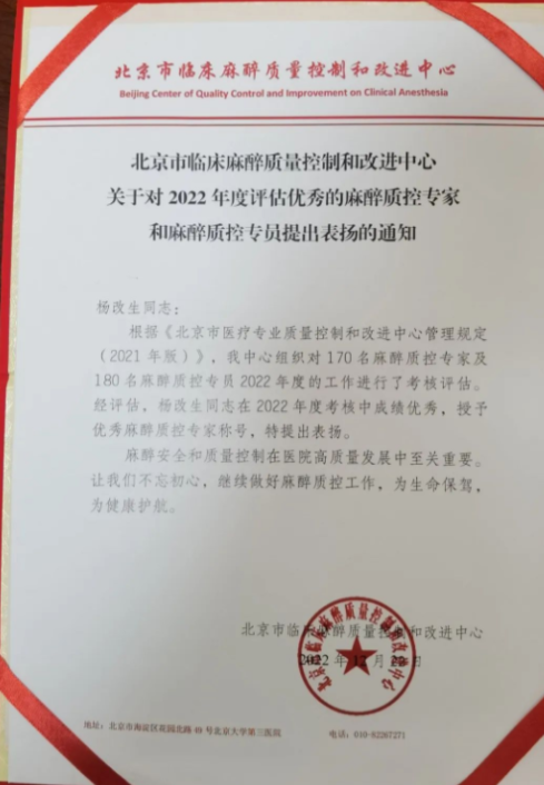 我院麻醉科杨改生主任荣获北京市“优秀麻醉质控专家”称号