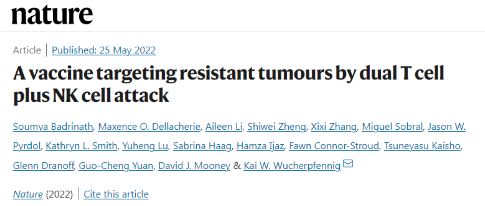 近日,美国哈佛大学的研究人员在国际顶尖期刊" Nature "上发表了一篇题为" A vaccine targeting resistant tumours by dual T cell plus NK cell attack "的研究论文。