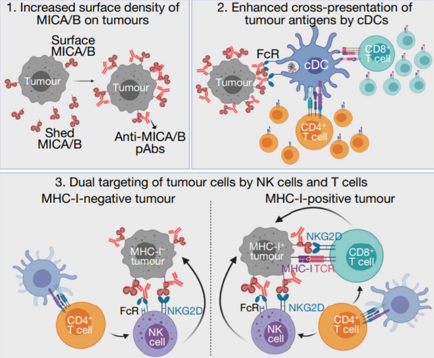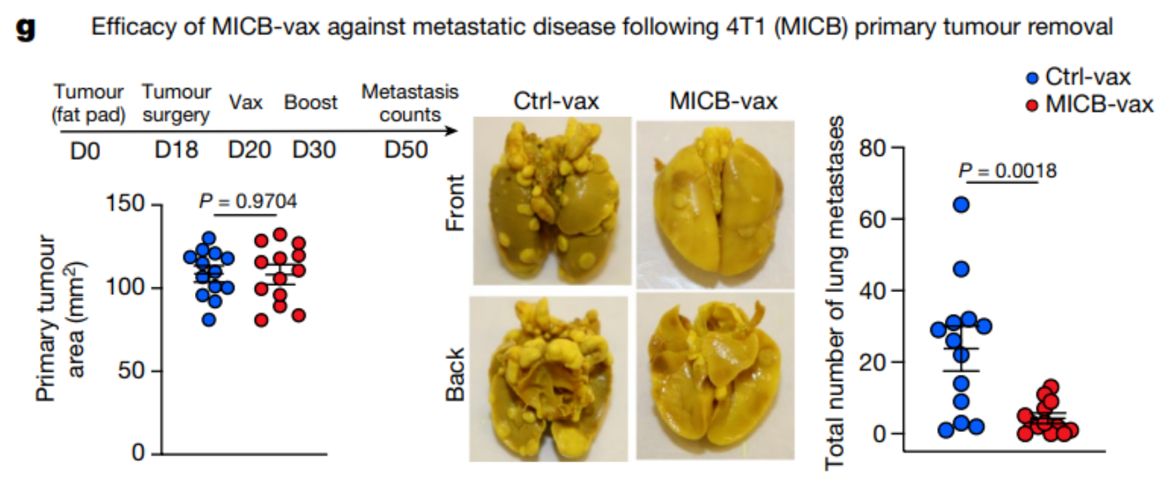 在MICB转基因小鼠中进行了疫苗接种实验,类似于人类癌细胞,研究显示,接种疫苗的小鼠抑制MICB脱落至无法检测的水平,并显著增加黑色素瘤细胞MICB的细胞表面蛋白密度,该疫苗在控制表达MICB或MICA的黑色素瘤细胞和淋巴瘤细胞方面显示出显著功效。