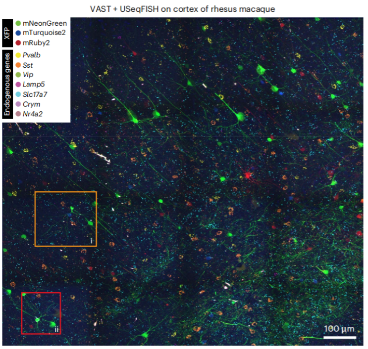 为了成功地将工程AAVs转化为基因治疗工具,研究人员通过扩展探针设计流程纳入了狨猴(Callithrix jacchus)和恒河猴 (Macaca mulatta)两个代表性的NHP物种,并验证了USeqFISH检测内源性mRNA(如主要抑制亚型:Pvalb、Sst和Vip)和完整脑组织中表达的病毒转录本的能力(图3)。此外,研究人员通过探索USeqFISH和病毒工具组合在NHP大脑多模态原位单细胞分析中的潜在应用,证明了USeqFISH的多功能性及其与其他单细胞标记和条形码方法的兼容性,并表明USeqFISH与病毒工具相结合可用于研究跨物种组织的细胞和分子结构。