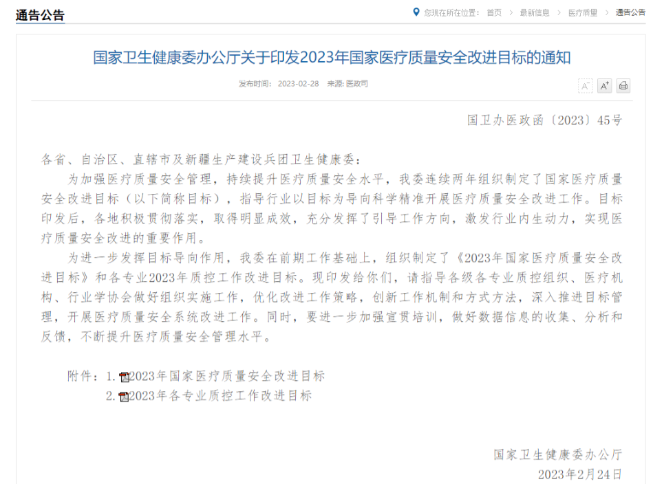 2月28日,国家卫健委医政司发布2023年《国家卫生健康委办公厅关于印发2023年国家医疗质量安全改进目标的通知》,明确提出: