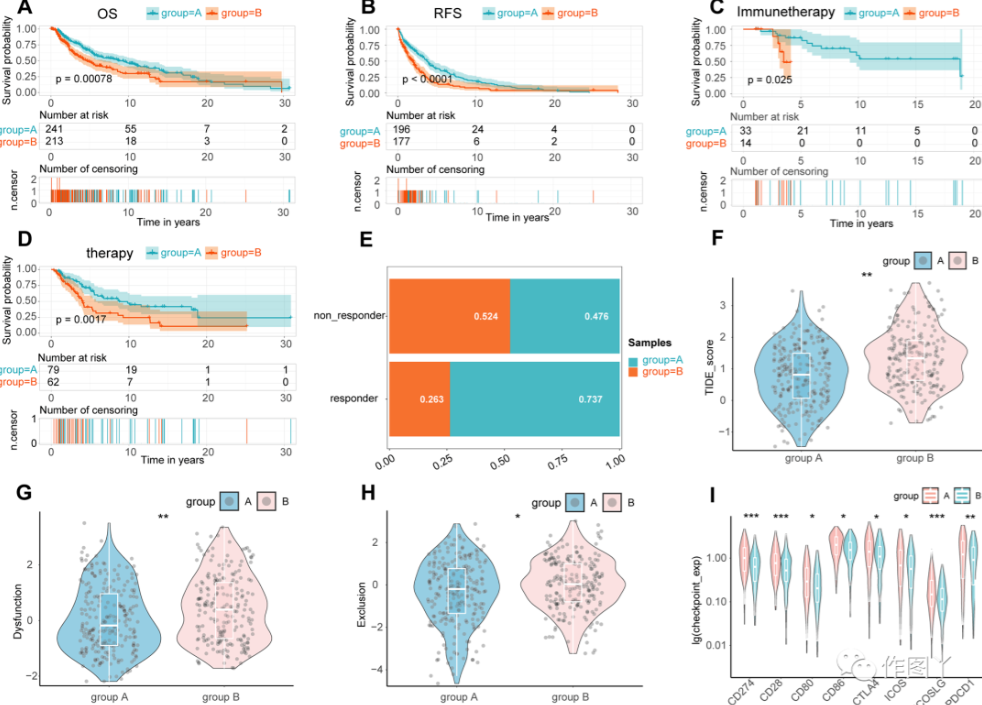 基于无监督聚类,本研究成功地将 TCGA-SKCM 数据分为两组,KM 分析表明 A 组的总生存期 (OS) 和无复发生存期 (RFS) 明显优于 B 组(图 2A、B),A组免疫治疗和化疗的效果明显优于B组(图2C、D)。所有TCGA-SKCM样本的TIDE分析结果显示,A组TIDE评分明显低于B组,A组免疫治疗应答率明显高于B组(图2E、F)。此外,A 组的功能障碍和排除评分显著低于 B 组(图2 G、H)。免疫检查点分析结果显示,A组CD274、PDCD1、CTLA4表达明显高于B组(图2I),以上结果提示A组免疫治疗的敏感性和疗效明显优于B组。