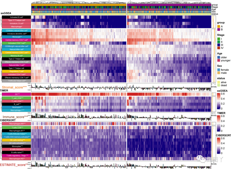 为了进一步研究两组之间 TME 的差异,本研究评估了两组的免疫评分,并使用四种方法估计了免疫细胞浸润的丰度(MCP、CIBERSORT、TIMER 和 ssGSEA),结果发现 A 组中 CD8 阳性 T 细胞、自然杀伤 T 细胞和巨噬细胞的丰度显著高于 B 组(图 3 )。上述结果进一步证实A组的免疫治疗反应和免疫活性优于B组。