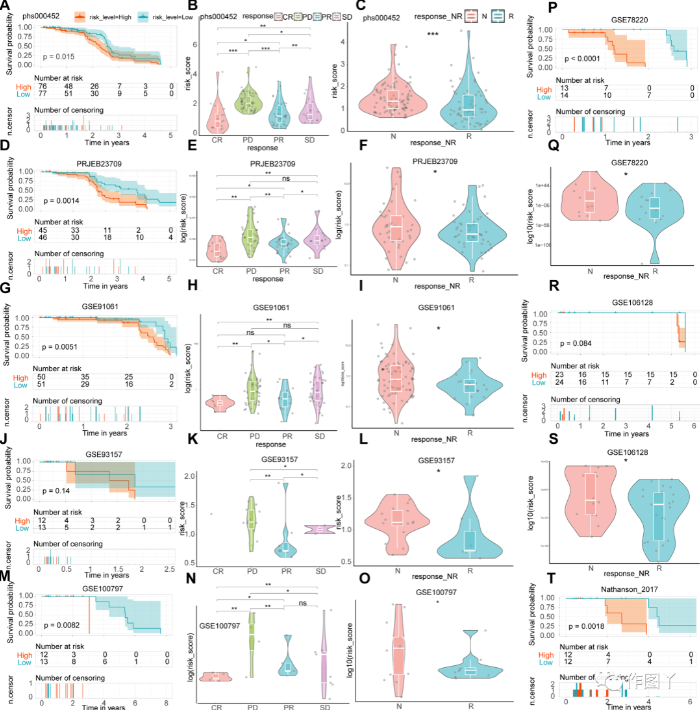 04、CRSS准确预测免疫治疗结果 本 研究在8组CM患者中验证了CRSS预测免疫治疗效果的能力。在包含免疫疗法完整临床信息的 phs000452 队列中,具有高铜死亡相关评分的 CM 患者的 OS 明显优于具有低铜死亡相关评分的 CM 患者(图 5A)。当比较 CM 治疗期间不同状态 CM 患者的 CRRS 时,本研究发现 CRRS 从完全缓解(CR)到部分缓解(PR)到疾病稳定(SD)然后到疾病进展(PD)逐渐增加(图 5B)。此外,对免疫治疗有反应的 CM 患者的 CRRS 显著低于对免疫治疗无反应的患者(图5C)。PRJEB23709、GSE91061、GSE93157、GSE100797、GSE78220 、GSE106128 和 Nathanson_2017数据集验证了本研究的结论(图 5D-T)。