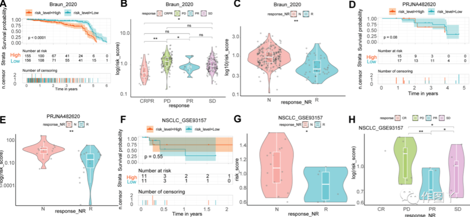 此外,当 CRSS 应用于其他肿瘤免疫治疗队列时,如肾细胞癌、胶质母细胞瘤和非小细胞肺癌 ,也能准确地预测了免疫疗法的效果(图 6A-H)。