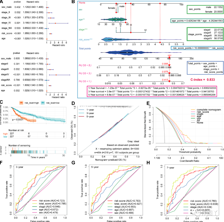 为了更有效地使用 CRSS 预测 CM 患者的预后,更准确地对临床中 CM 患者的风险进行分层,本研究纳入了三个临床特征(年龄、性别和 AJCC 分期)以及使用 CRSS 来预测 CM 患者的预后。构建预后诺模图模型,单因素(图 8A)和多因素(图 8A)COX 回归分析显示 CRSS 是 CM 患者的独立危险因素。然后,本研究基于这四个变量构建诺模图模型,量化每个变量的得分,并构建总分计算公式和生存概率计算公式(图8B)。