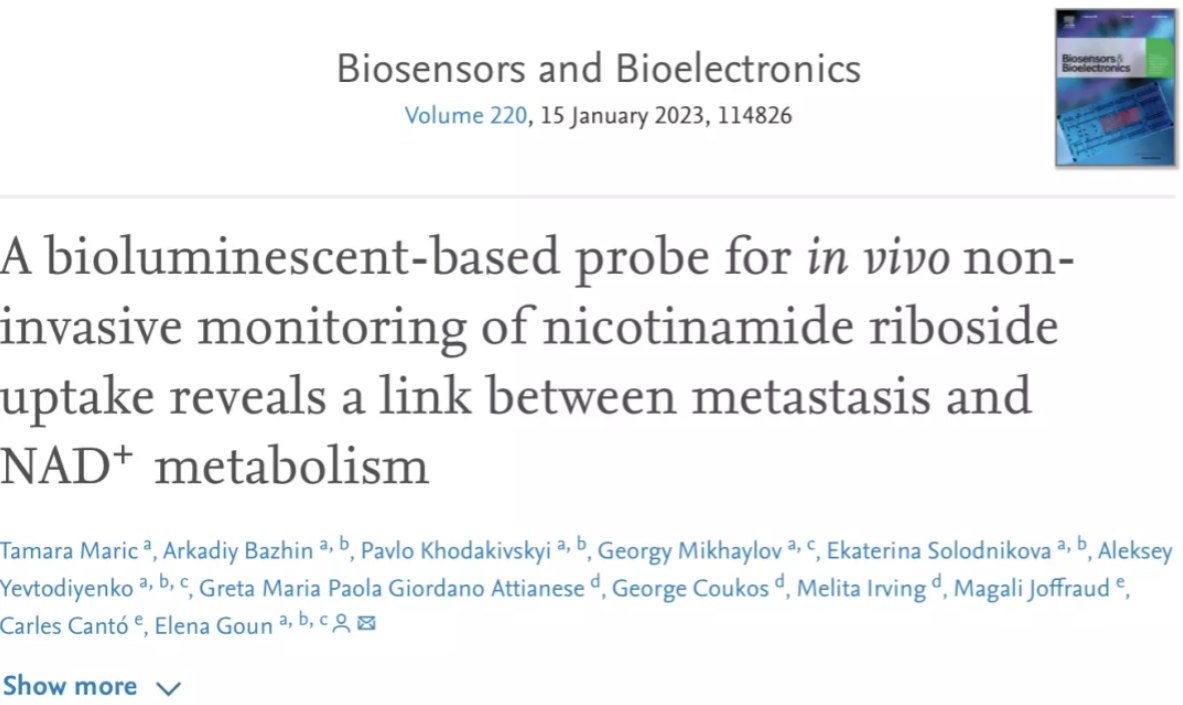 [1]Maric T, Bazhin A, Khodakivskyi P, Mikhaylov G, Solodnikova E, Yevtodiyenko A, Giordano Attianese GMP, Coukos G, Irving M, Joffraud M, Cantó C, Goun E. A bioluminescent-based probe for in vivo non-invasive monitoring of nicotinamide riboside uptake reveals a link between metastasis and NAD+ metabolism. Biosens Bioelectron. 2022 Oct 29;220:114826. doi: 10.1016/j.bios.2022.114826. Epub ahead of print. PMID: 36371959.