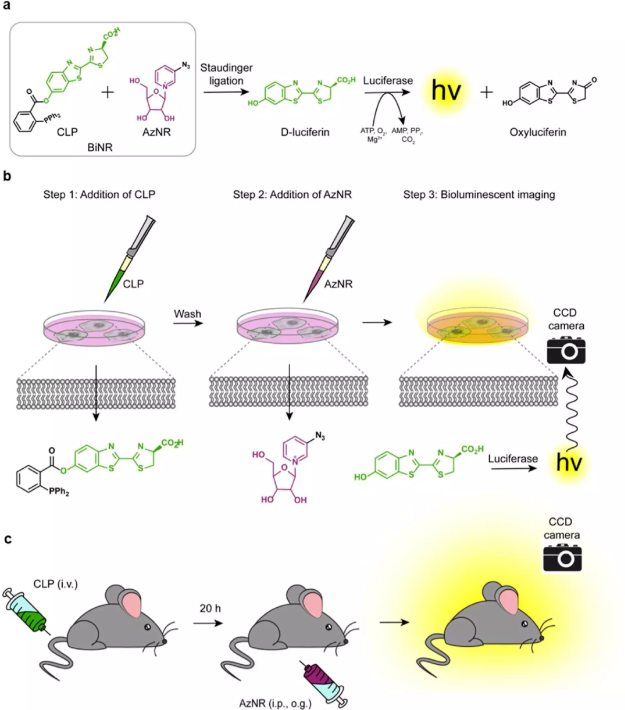 本研究中,该研究团队开发了 一种NR吸收成像 (BiNR) 的生物发光探针,用于体内体外NR的非侵入性纵向监测。 在这项技术中,NR的存在可以很好被检测到,光线越亮,意味着NR的浓度越高。 为了使BiNR探针能够运用于临床样本,研究者进一步优化了检测方法,即在不需要使用荧光素酶基因转染细胞的情况下,就能有效监测NR通量,从而应用于人类T细胞中。