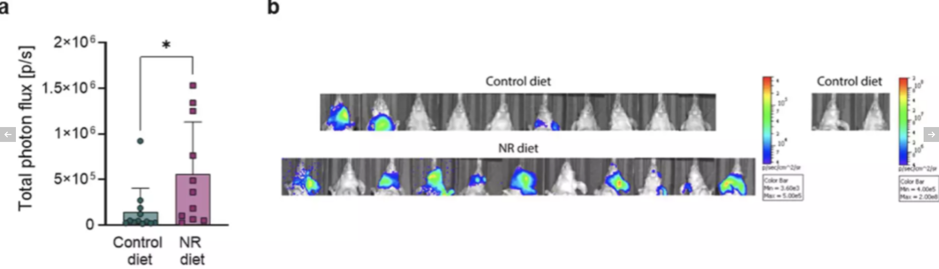 接着,基于开发出来的BiNR技术,研究者使用富含NR的饮食喂养三阴性乳腺癌 (TNBC) 模型的小鼠,以探明NR补充剂对肿瘤的发生及转移的影响。 实验结果显示,仅10周的时间,补充NR组的小鼠中,有70%的体内形成了可检测到的肿瘤,而这个比例在对照组中仅为55%。 也就是说,NR补充剂使小鼠的肿瘤发生率显著增加了27%。 在评估“NR补充剂对肿瘤转移率的影响”的实验中, 研究者发现补充NR显著增加了脑转移瘤的形成,比对照组高出227.2%! 不仅如此, 小鼠头部区域的生物发光信号显示,富含NR喂养组的信号比对照增加了3.8倍,意味着大脑中转移灶数量明显更多。