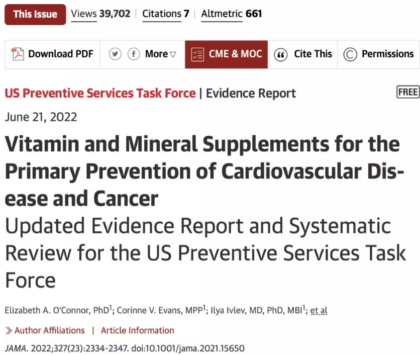 [3]US Preventive Services Task Force. Vitamin, Mineral, and Multivitamin Supplementation to Prevent Cardiovascular Disease and Cancer: US Preventive Services Task Force Recommendation Statement. JAMA. 2022;327(23):2326–2333. doi:10.1001/jama.2022.8970