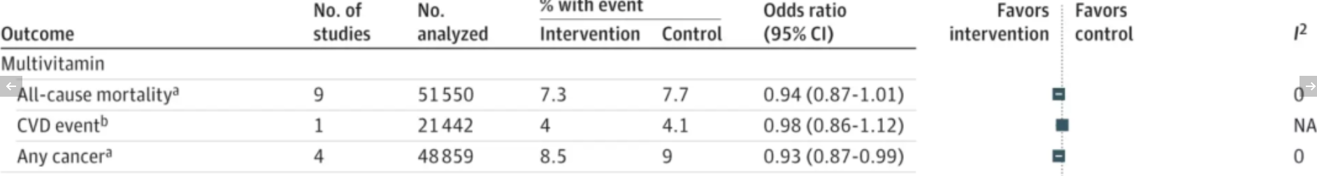 USPSTF的这项综述共包括84项研究,其中78项RCT和6项队列研究,涵盖了近74万人。综合分析维生素以及矿物质补充剂对癌症、心血管疾病、全因死亡的预防效果后,结果显示: ①复合维生素补充剂