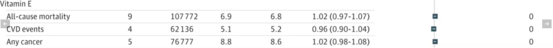 维生素E是重要的抗氧化剂之一,一直以来被认为“可以预防心血管疾病”。但汇总证据显示,维生素E在预防全因死亡、心血管疾病和癌症上并无效果,研究结果没有统计学差异,即没有临床净获益。