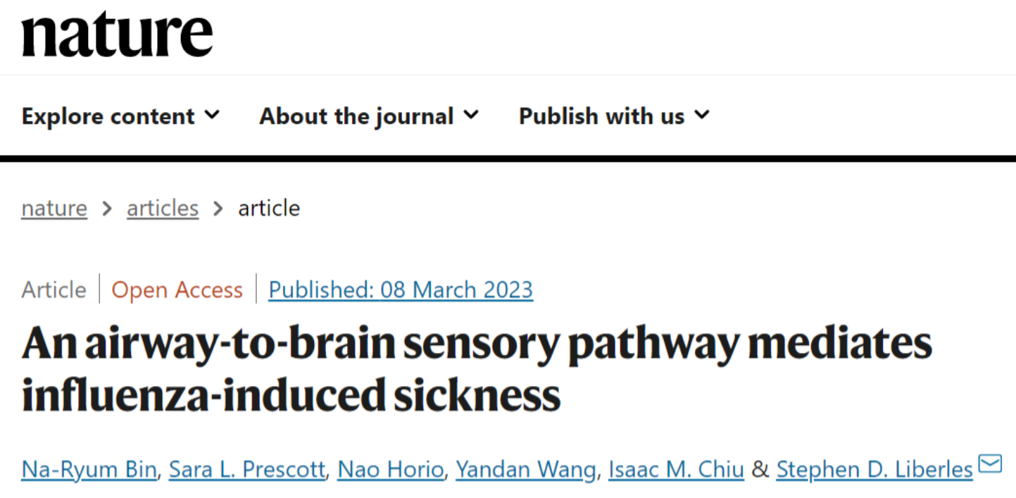 2023年3月8日,哈佛大学医学院的研究人员在国际顶尖学术期刊 Nature 上发表了题为: An airway-to-brain sensory pathway mediates influenza-induced sickness 的研究论文。 该研究发现,哺乳动物呼吸道中的一组GABRA1神经元通过表达的前列腺素E2受体3(EP3),一旦感知到流感病毒感染产生的前列腺素E2 (PGE2) ,就会向大脑传递信号,引发常见的流感症状。