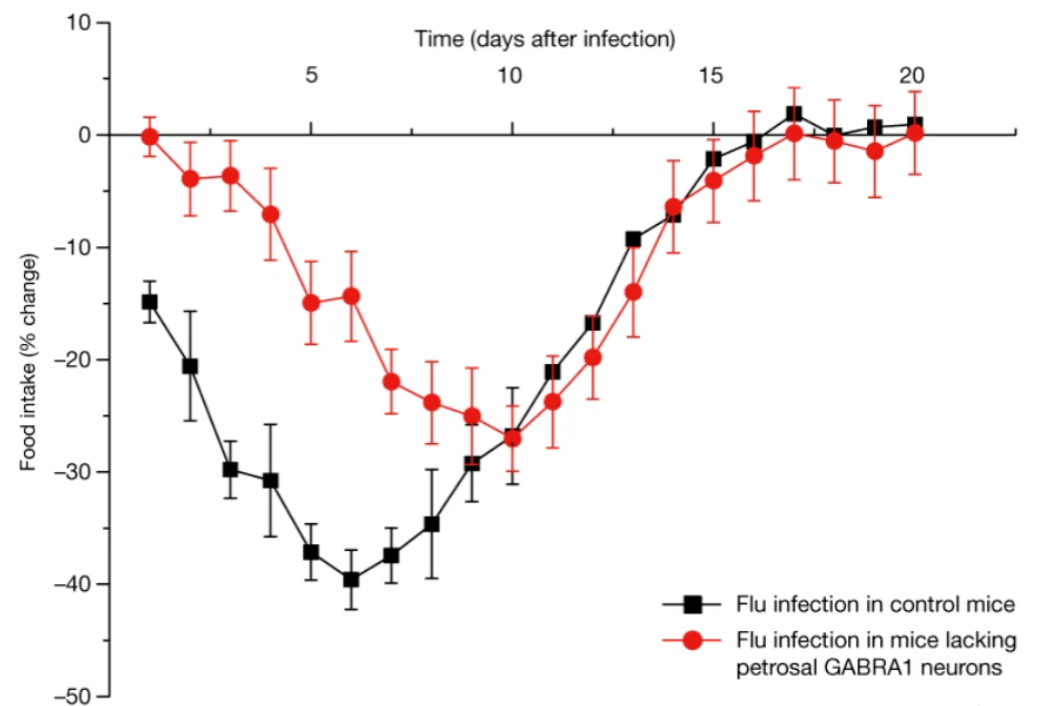 而当GABRA1神经元功能受损或抑制其EP3,都能够减轻流感早期的症状 (包括食欲降低、活动减少等) ,并提高其生存率。 这些结果表明, 人类和哺乳动物存在一些特殊的“疾病神经元”,可以感知病毒感染,并通知大脑产生相应的疾病症状。
