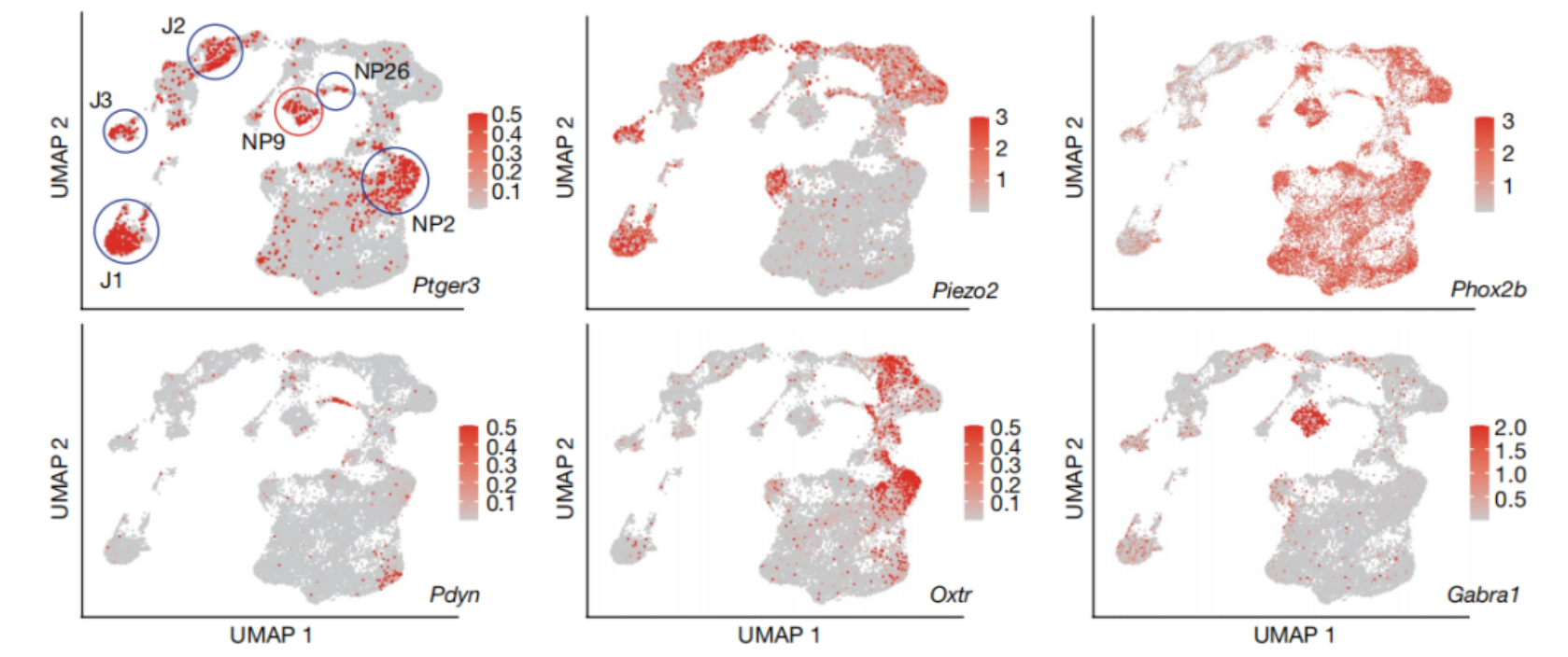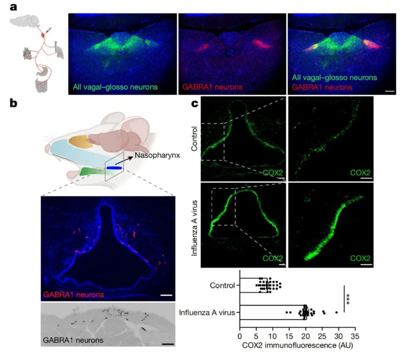 GABRA1神经元感应呼吸道中的流感感染 有意思的是,这种神经元位于小鼠的颈部,从扁桃体延伸到脑干,而扁桃体区域是外部空气和气道内空气交汇的界面。该区域富含免疫细胞,当它们遇到病原体时会大量产生前列腺素。 这些结果表明,GABRA1神经元在呼吸道感染中发挥着重要功能——用于检测病毒感染引起的前列腺素水平升高,并将被感染的信号发送到大脑,进而引起相关的疾病行为。