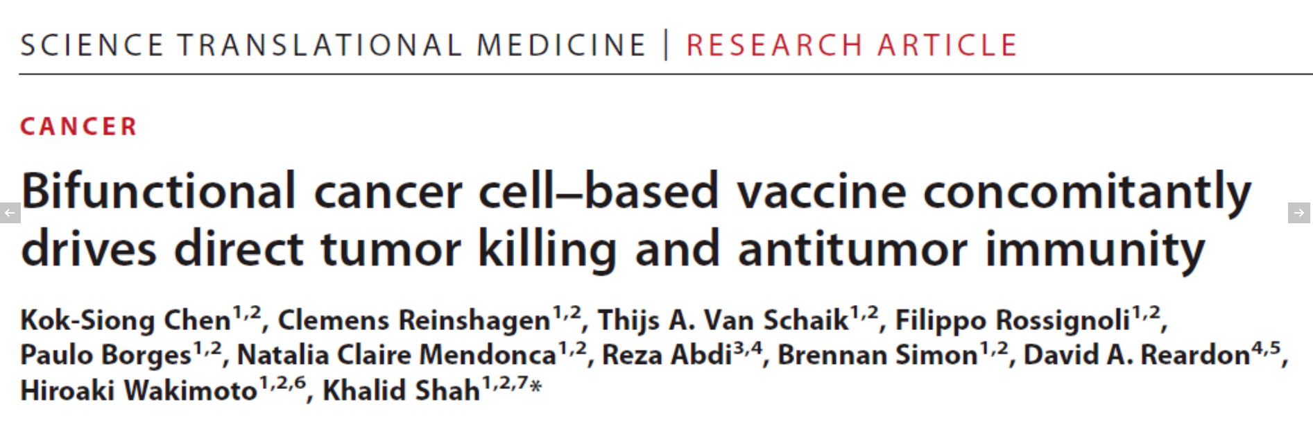 2022年1月,哈佛大学医学院的研究人员在 Science 子刊 Science Translational Medicine 上发表了题为: Bifunctional cancer cell–based vaccine concomitantly drives direct tumor killing and antitumor immunity 的研究论文。 研究的开发了一种 将癌细胞转化为有效抗癌疫苗 的新方法,可以消除已产生的肿瘤,并诱导长期免疫,训练免疫系统使其防止癌症复发。研究团队在晚期致命脑肿瘤胶质母细胞瘤小鼠模型中验证了这种双功能抗癌疫苗的有希望的效果。