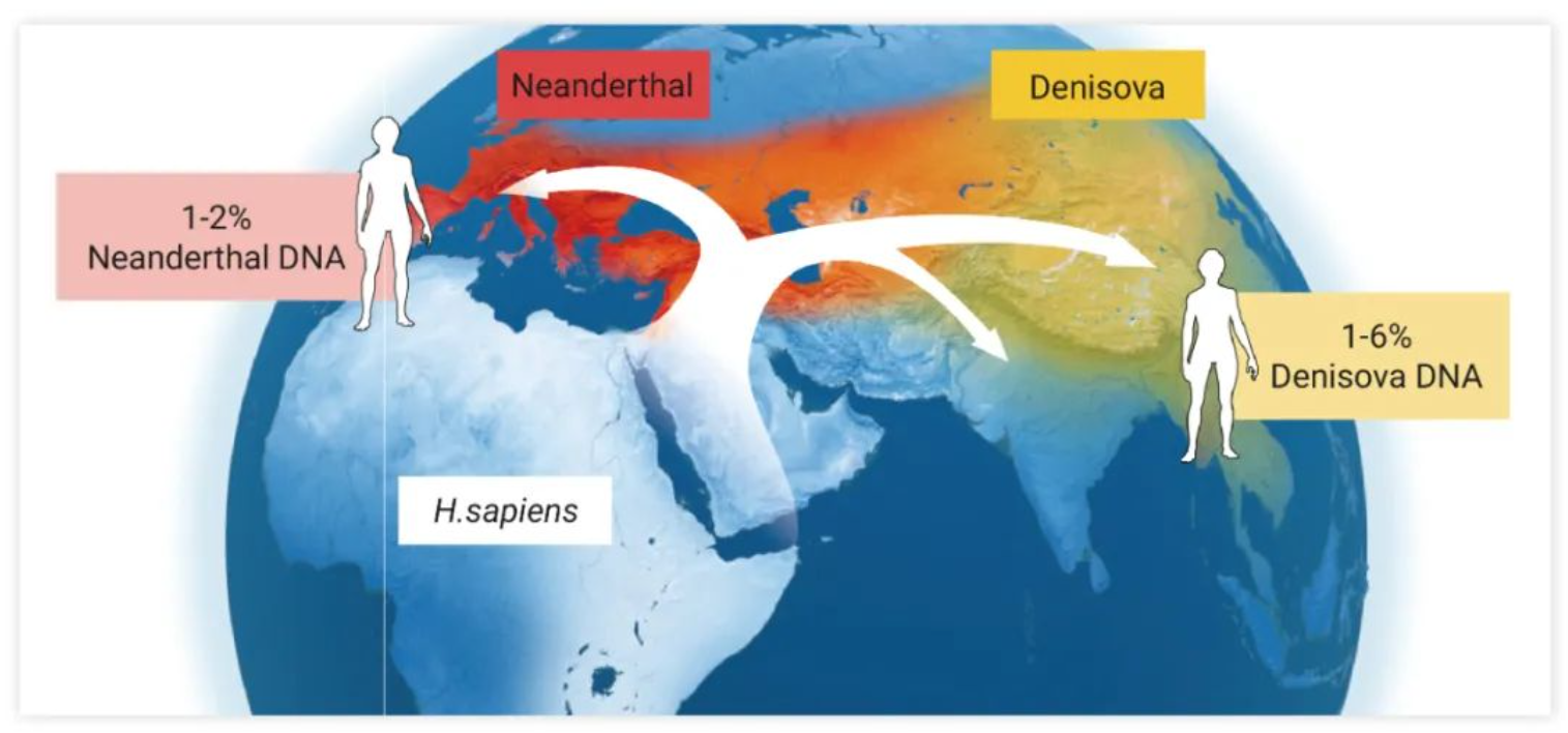 图 4. Pääbo 的发现为智人从非洲迁移至世界各地这一观点提供了有力证明。尼安德特人生活在欧亚大陆的西部,丹尼索瓦人生活在东部。当智人遍布非洲大陆时,生出混血后代,并在现代人类的 DNA 中留下了痕迹[3]