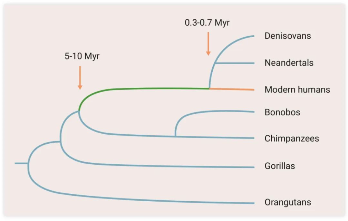 图 5. 现代人类、尼安德特人、丹尼索瓦人和类人猿之间的进化关系图。500-1000 万年前类人猿与人类 (绿色分支) 发生种群分离,30-70 万年前现代人类 (橙色分支) 与尼安德特人、丹尼索瓦人发生种群分离[4]