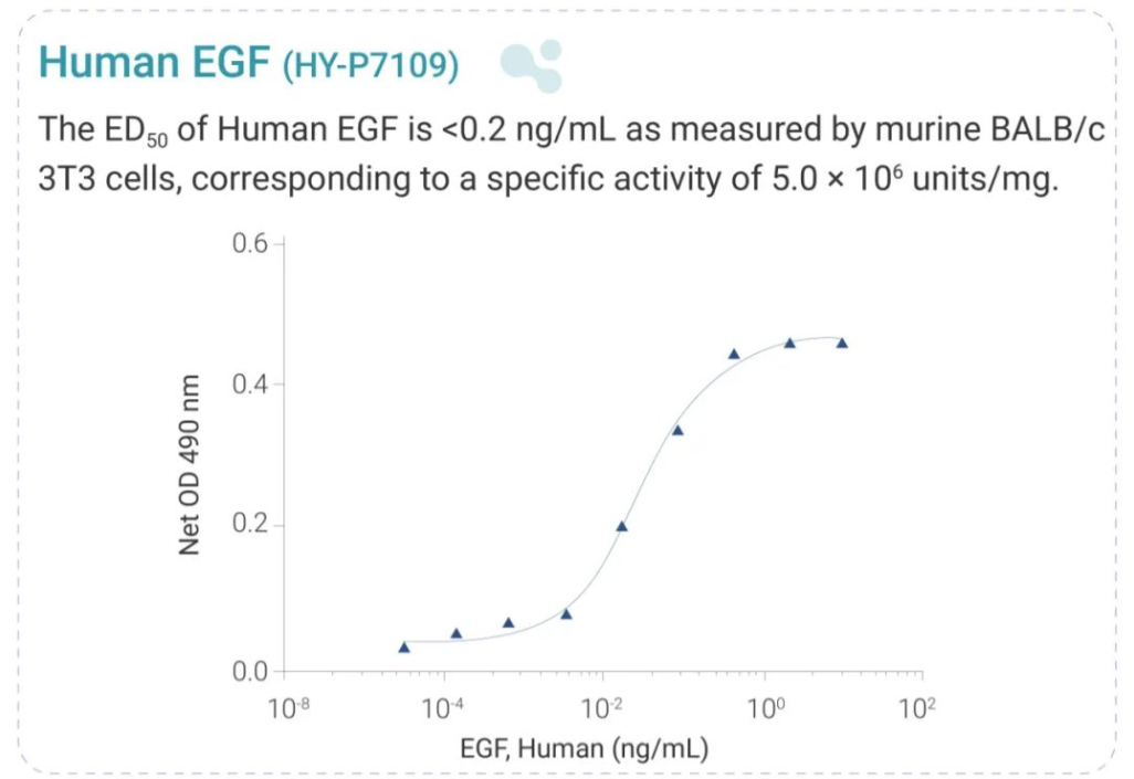 小贴士:如何将 ED50 转换为比活力单位?: 如下图中,通过Human EGF 剂量依赖性刺激小鼠 BALB/c 3T3细胞增殖,ED50 <0.2 ng/mL。