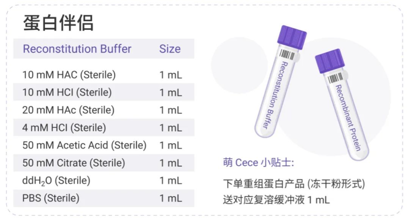 短期实验:使用复溶 Buffer 直接溶解的重组蛋白,液体可在 2-8℃ 最长保存 1 周。对于周期较短的实验 (不超过 7 天),可以直接取该条件下保存的细胞因子或者重组蛋白溶液加入到培养体系内即可,一周之内用完。(复溶 Buffer: 可参考重组蛋白使用指南里建议的溶液或者使用已贴心搭配好的蛋白伴侣)